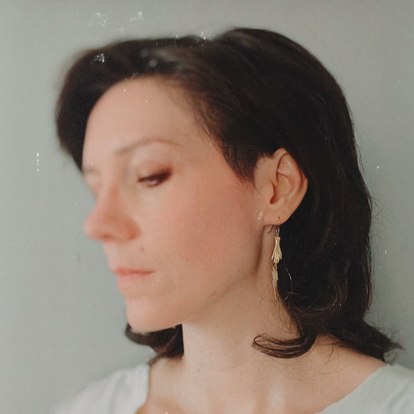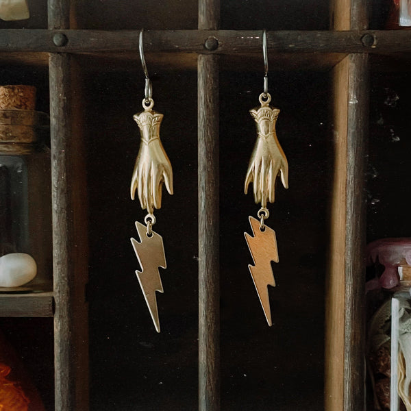 Brass Victorian hand and lightning bolt charms with handmade brass jump rings on handmade surgical steel ear wires. Approximately 2.5" in length including ear wire. Always made in small batches by hand.